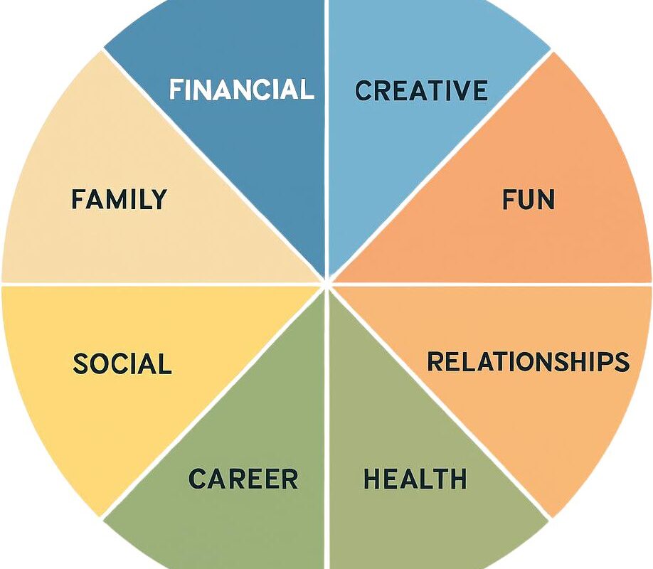 The image is one example of the wheel of a balanced life. It is divided in equal parts. Although they may not be equal in your life, people who experience a sense of wellbeing tend to have something positive happening in each part of the wheel.