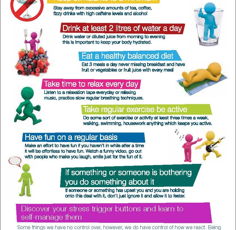 The wee image with this piece offers some ideas to help manage stress, why not download it and put it somewhere you will see it each day as a reminder of things to do to help reduce the impact of stress on your wellbeing and share with others who may find it of interest. The ideas are simple but the results can be significant