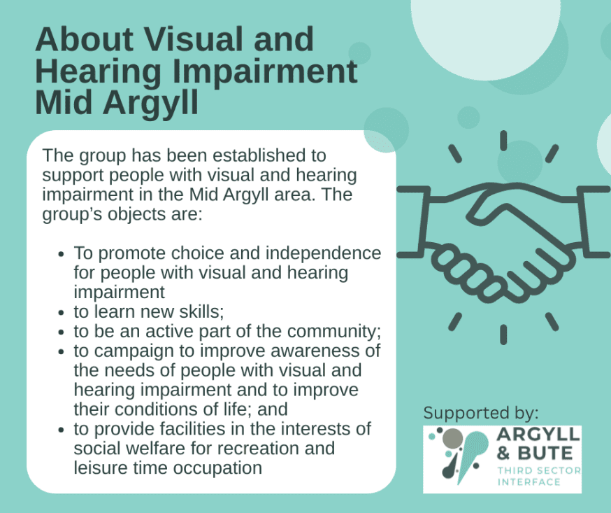 Visual and Hearing Impairment Mid Argyll is a small but dedicated community group working to support people living with sight and hearing impairment in the local area. The group offers connection, understanding, and practical help but now they are looking for new volunteers to take on key roles and increase the resources and support the group can offer.